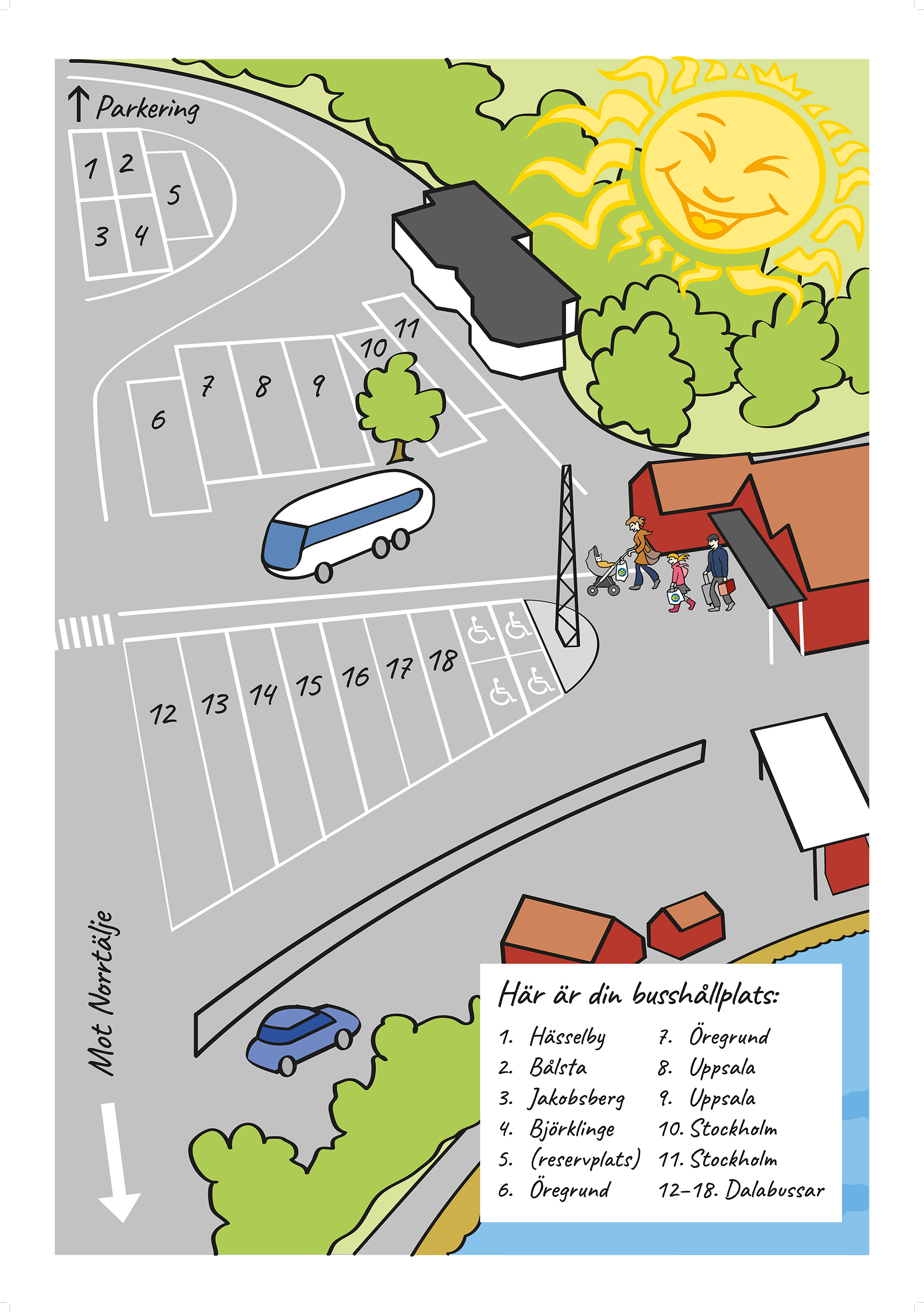 Se karta över hamnplan med bussparkering här